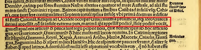 Extract from the Decades of the New World by Peter Martyr d’Anghera, in the original Latin, on the meaning of the aboriginal toponym Guacayarima.