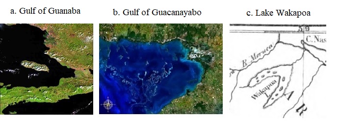 In the south of the eastern region of Cuba, there is a gulf that preserves its aboriginal name, Guacanayabo (Figure 2b). In its structure, the morpheme guaca can be distinguished.